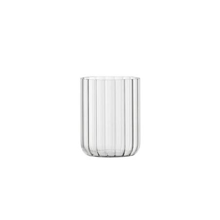 Este vaso, ideal para cócteles y aperitivos sofisticados, presenta líneas verticales y facetas luminosas que le confieren una gran elegancia.